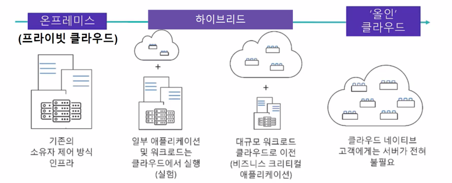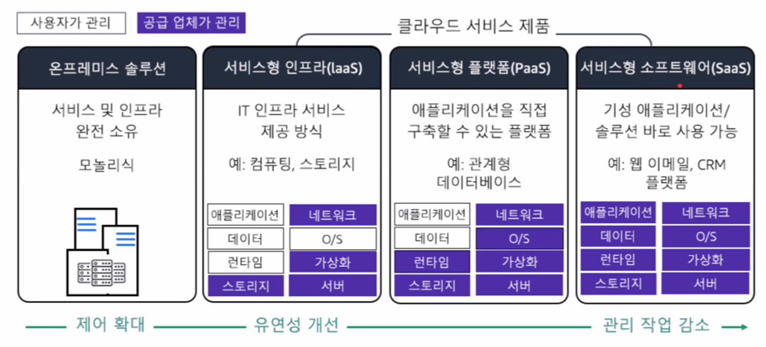 - 물리적 데이터 센터와 서버를 구입, 소유 및 유지 관리하는 대신 클라우드 공급자(CSP)로부터 필요에 따라 컴퓨팅 파워, 스토리지, 데이터베이스와 같은 기술 서비스에 액세스 할 수 있음