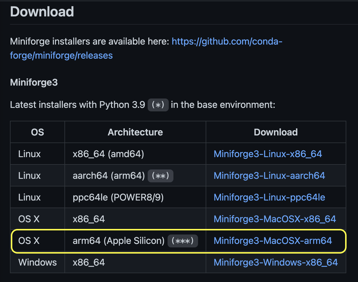다행히 Miniforge는 공식적으로 Apple Silicon을 지원한다.