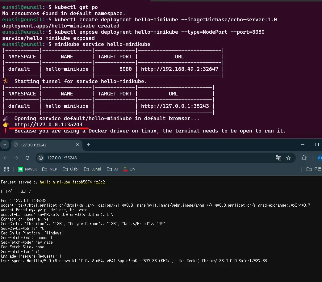 - minikube service [서비스 이름] 으로 NodePort를 통한 접근 가능