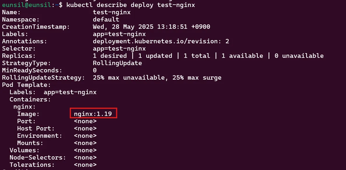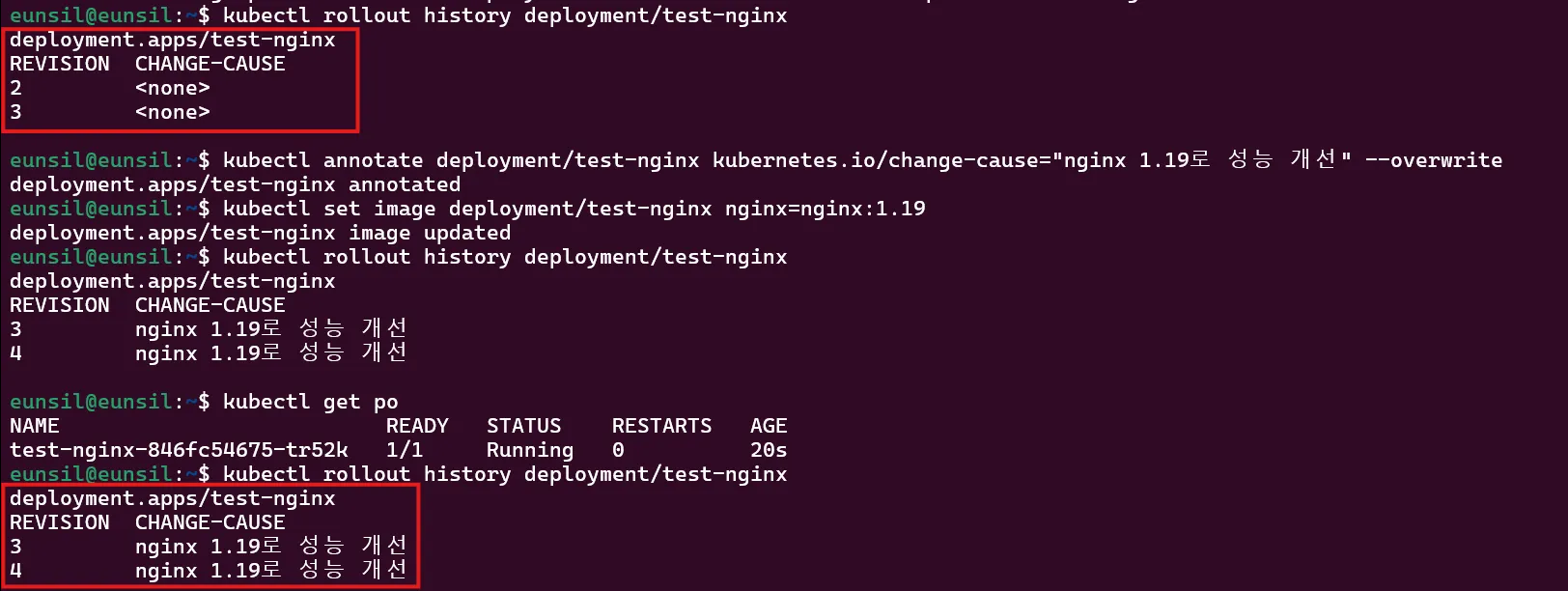 kubectl annotate deployment/test-nginx kubernetes.io/change-cause="nginx 1.19로 성능 개선" --overwrite