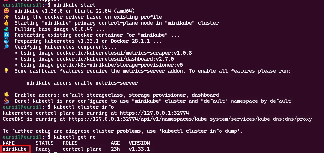 # minikube를 정지시켜놓은 상태라면 다시 실행시켜줘야 함